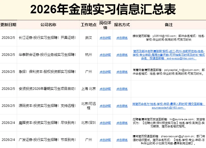 ☛ 投行券商2026岗位信息汇总表(持续更新)
