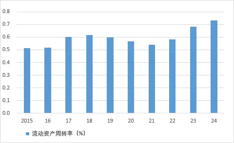 流动资产周转率走势与总资产周转率大体一致,流动资产在总资产占比84%,