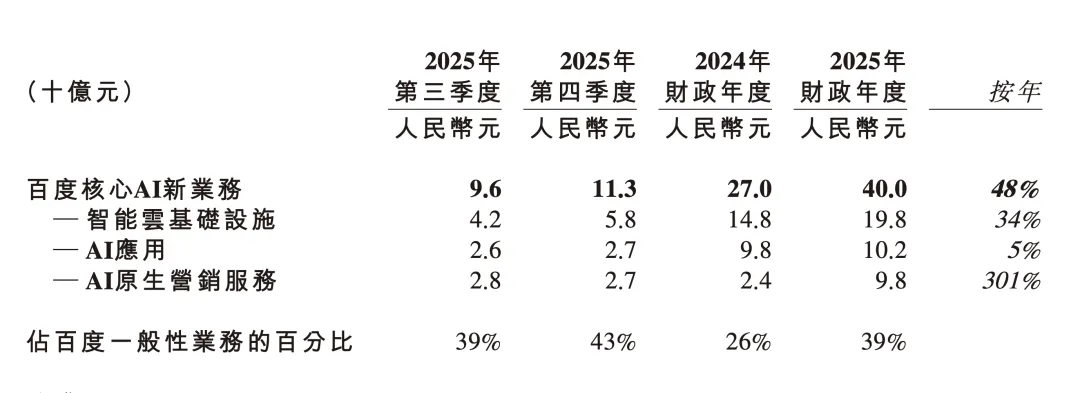 百度的整体收入中,AI原生营销服务收入增长是最快的,2025全年收入同比增长301%,第四季度收入为27亿,同比增长110%。