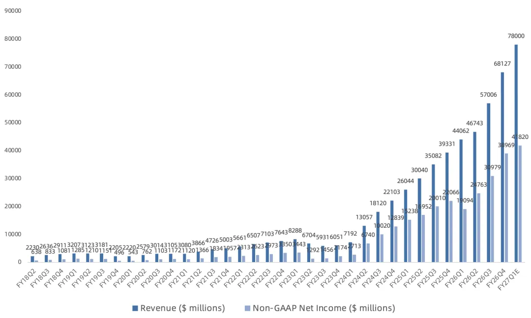 总的来说,英伟达这份财报再次驳斥了AI泡沫论的言论,也再次回应了市场关于旧卡折旧、毛利率下滑的担忧,继续支撑美股AI半导体叙事,但公司自身却再次沦为众矢之的。FY26全年实际NonGAAP净利润1138亿美元,与我们此前测算一致,按目前指引,预计FY27全年净利润2000亿美元起步。