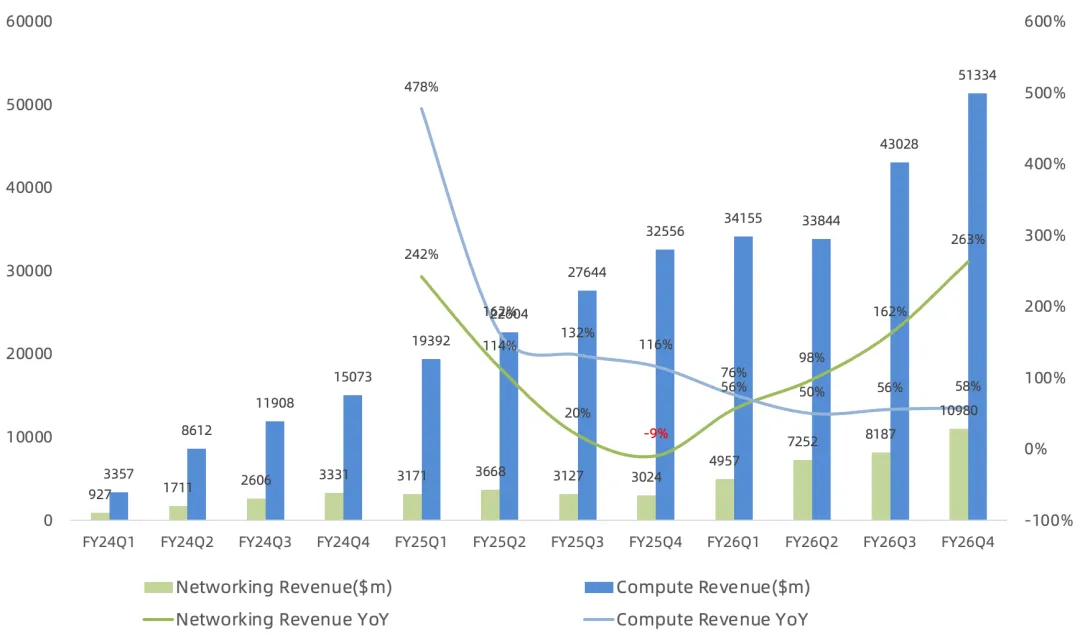 计算营收513亿美元,同比增长58%,环比增长19%,其中Grace Blackwell机柜(GB200/GB300)本季度约占数据中心收入的2/3。 网络营收110亿美元,同比增长263%,环比增长34%,首次突破单季度100亿美元大关,网络业务规模全球第一;scale-up与scale-out技术需求均创纪录,二者环比均实现两位数增长,主要由NVLink、Spectrum-X以太网以及 InfiniBand的强劲采用所驱动;NVLink极大推动了网络业务增长,每个机架都配有9个交换节点,每个节点有2颗NVLink芯片,未来会更多,每个机架对应的交换量非常惊人,NVLink开辟又一增长曲线:本季度宣布将为AWS启用NVLink Fusion(ALAB),以便其与自研芯片实现集成;英伟达自收购Mellanox以来,网络营收已增长超10倍。