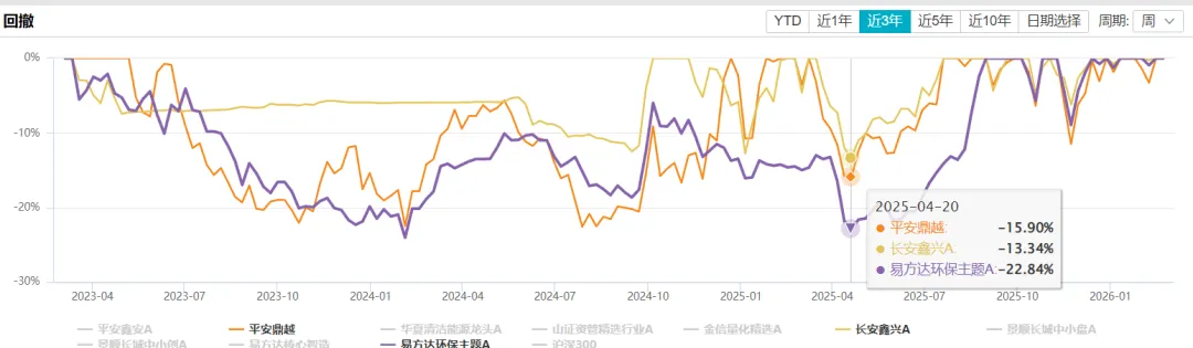 从回撤角度看,表现较好的依次是平安鼎越、长安鑫兴A、易方达环保主题A,如下图: