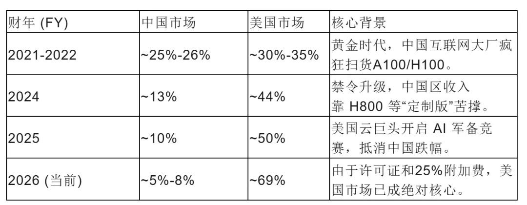 中国市场和美国市场对英伟达收入的贡献占比