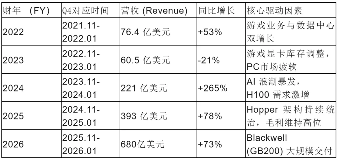 英伟达 FY2022 - FY2026 第四季度收入对比