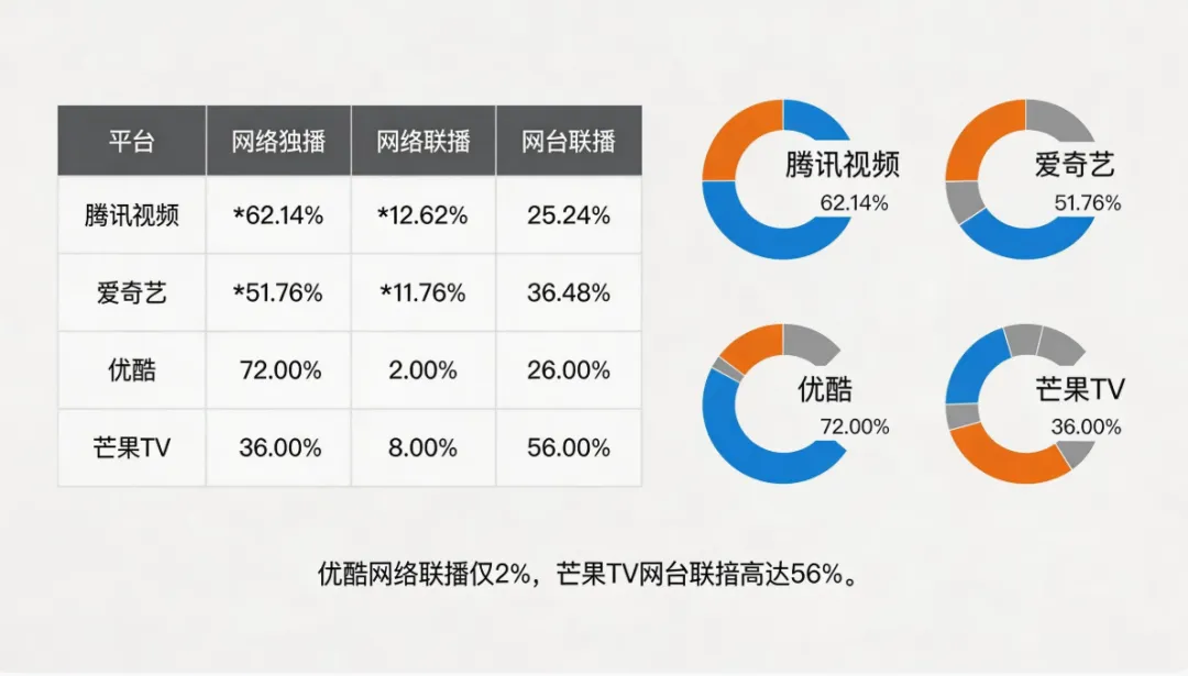 腾讯视频依然保持着内容储备的优势,但真正让人意外的是优酷。72%的独播剧占比,2%的网络联播比例,这家平台几乎是在用“孤注一掷”的姿态赌独家内容。