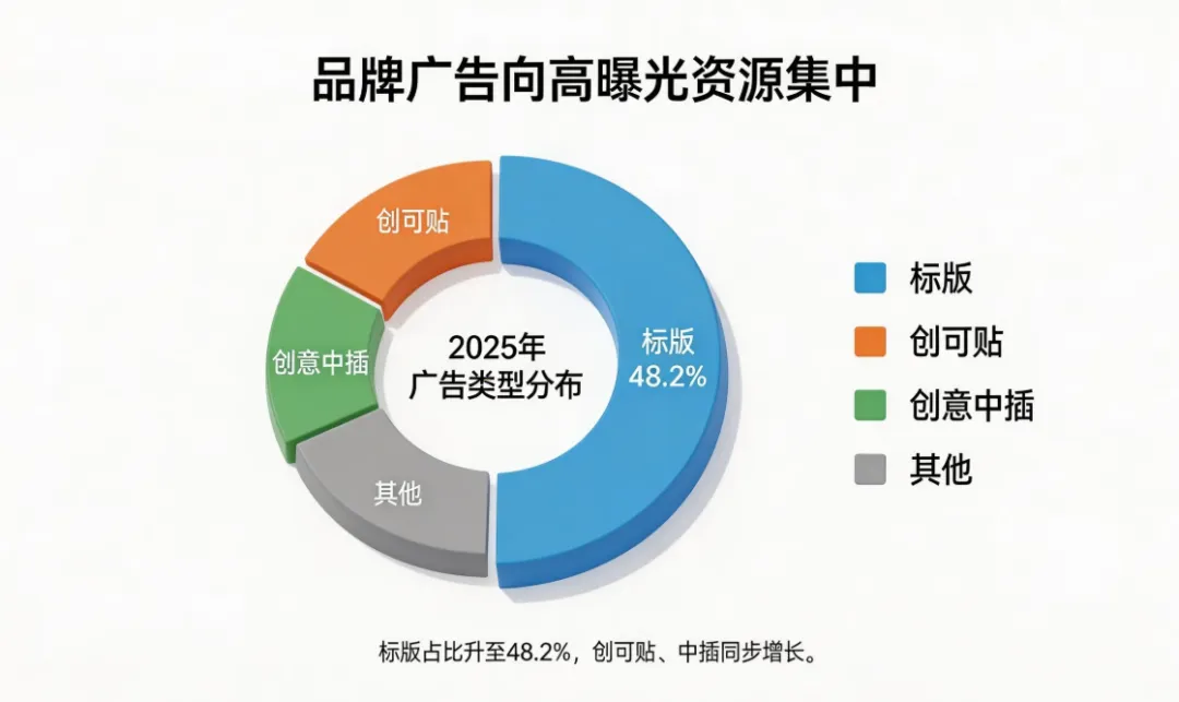 标版广告占比提升至48.2%,创可贴、创意中插占比同步增长。 品牌不再满足于logo露出,而是要“融进剧情里”。