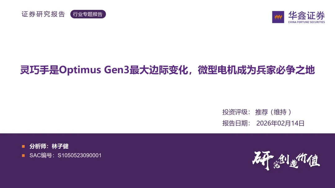华鑫证券 2026 年 2 月 14 日发布的微型电机行业专题报告指出,灵巧手是特斯拉 Optimus Gen3 人形机器人最大边际变化,微型电机作为灵巧手核心部件,成为行业兵家必争之地,未来市场空间广阔,相关企业迎来发展机遇。————