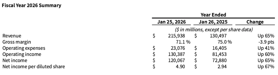 营收与利润再创新高: FY26财年总营收达到2159.38亿美元,较上一财年的1304.97亿美元大幅增长65%。净利润高达1200.67亿美元,同比大增65%。