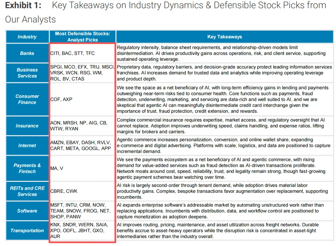 从行业层面审视,研报覆盖的多个领域呈现出颠覆风险与采用收益并存但净影响偏正面的格局。银行业被明确界定为AI净受益者,监管强度、资产负债表要求及关系驱动型商业模式限制了脱媒风险,AI驱动的运营效率提升已在大型银行中实现每年超过200个基点的正向经营杠杆。商业服务领域中的信息服务商凭借专有数据资产、品牌壁垒及监管门槛具备较强的AI风险防御能力,评级机构、征信局及指数提供商被认定为最具防御性的子行业。消费金融板块同样被视为净受益者,核心功能如支付、欺诈检测、信贷审批等数据密集型且规则驱动的业务环节高度适配AI应用,尽管需警惕AI驱动的就业流失对消费信贷质量的潜在冲击。保险经纪行业短期内难以被AI替代,复杂商业保险合约的构建、市场准入及监管合规仍需专业人工介入,而AI应用有望通过提升核保速度与理赔效率改善费用率。