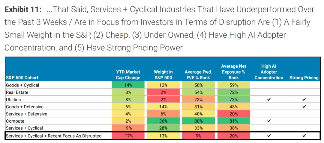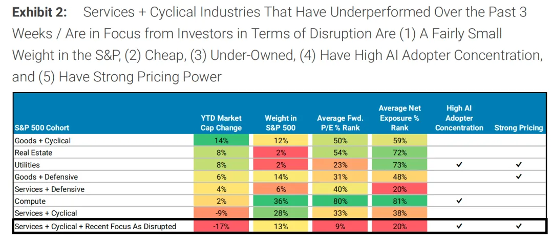近期市场对AI颠覆风险的担忧导致服务型与周期性行业出现显著回调,然而这一抛售可能存在过度反应。数据显示,被投资者视为受AI颠覆影响的服务型+周期性板块在标普500中的市值占比仅为13%,该板块当前估值处于2010年以来第9百分位的历史低位,机构持仓水平降至第20百分位。更为重要的是,这些行业同时具备高AI采用者集中度与强定价能力两大特征,这意味着短期内的效率提升收益有望对冲长期的结构性颠覆风险。