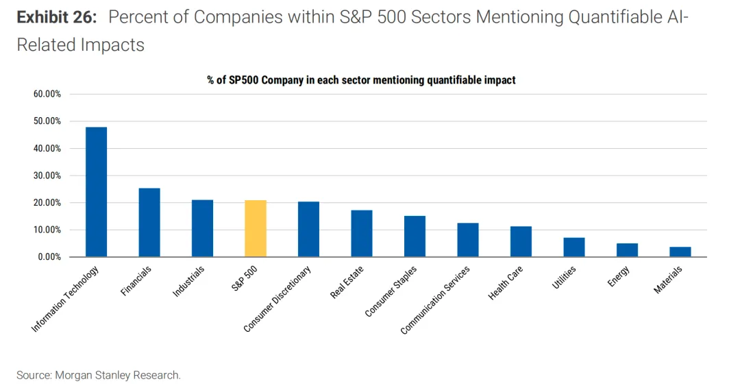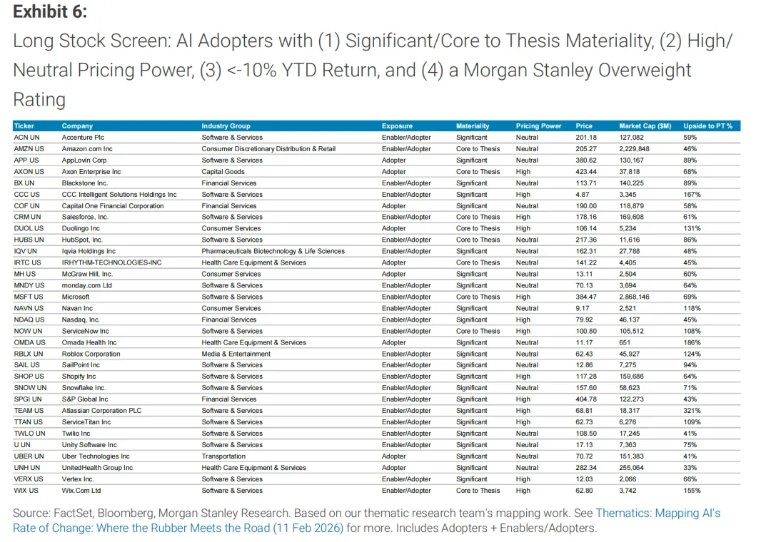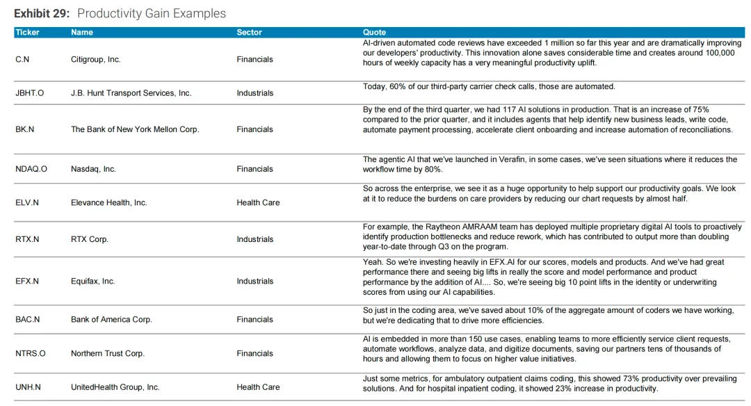 从AI采用进展来看,企业层面的量化收益披露正在加速。基于对超过10000份财报及电话会议纪要的系统分析,被分析师界定为AI采用者的公司中,提及至少一项可量化AI影响的比例已从2024年第四季度的16%上升至2025年第四季度的30%,而整个标普500的这一比例也从10%提升至21%。这一趋势表明AI采用正从概念验证阶段向实际收益兑现阶段过渡。利润率预期数据进一步支持这一判断:具备显著AI采用重要性且定价能力为中性或高水平的AI采用者群体,其远期净利润率预期持续加速上升,且年初至今跑输大盘超过10%的AI采用者子群体同样呈现利润率预期反弹态势。