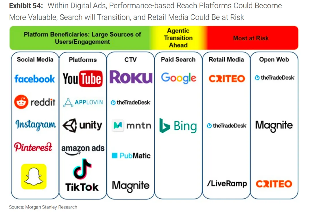互联网板块的代理式商务被视为GenAI赋能的下一个重要突破口,个性化购物体验有望推动电商渗透率进一步提升。支付生态系统特别是万事达与Visa被定位为AI及代理式商务的净受益者,AI驱动交易所带来的身份验证、欺诈检测等增值服务需求将强化网络护城河。商业地产服务领域的AI脱媒风险在短期至中期内有限,复杂交易咨询的高度定制化特性构成进入壁垒。
