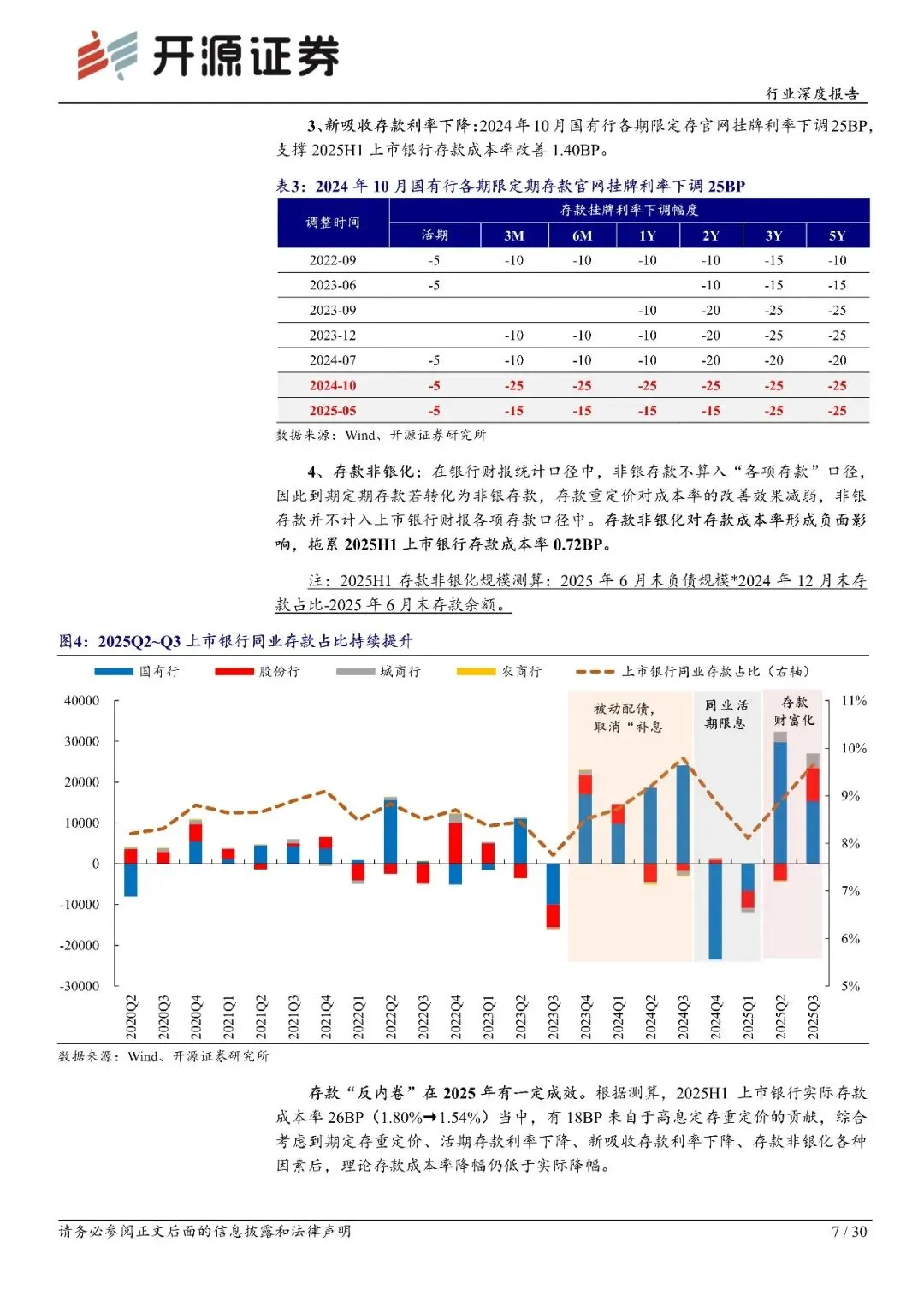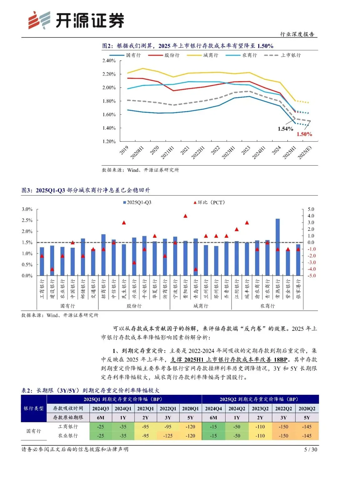 2025H1 存款定价“反内卷”推动息差企稳,2025H2 我们预计还会下降 3BP 左右至 1.50%左右。综合考虑到期定存重定价、活期存款利率下降、新吸收存款利率下降、存款非银化各种因素后,2025H1 上市银行理论存款成本率降幅仍低于实际降幅。一是源于存款结构优化(期限缩短,高息存款占比下降),二是存款利率自律上限降幅较挂牌幅度更大,使得实际存款执行利率较低,2025 年 5 月调整后,国有行和股份行 3 年期定存分别为 1.55%/1.75%,较 2021 年分别下降170BP/175BP,存款挂牌降幅则为 150BP。