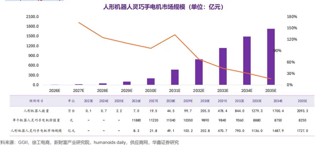 人形机器人灵巧手电机市场空间巨大。电机是实现电能向机械能转换的枢纽,灵巧手电机性能直接影响人形机器人工作能力、灵活性、稳定性和能效等多方面的表现。我们预测到2030年灵巧手电机市场规模有望达到202.8亿元,到2035年有望达到1727.0亿元市场规模,2026- 2035年CAGR为81.1%。