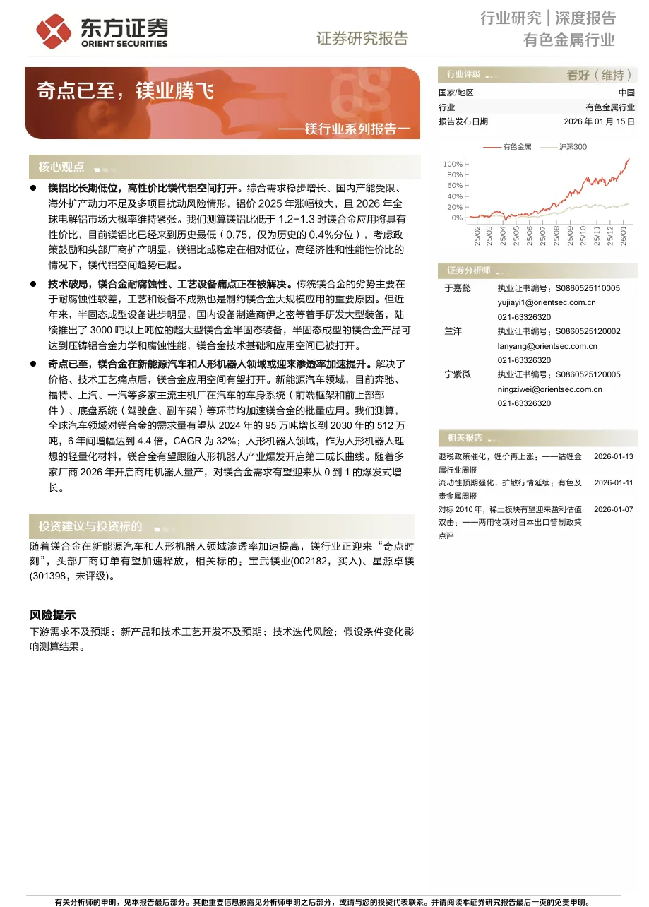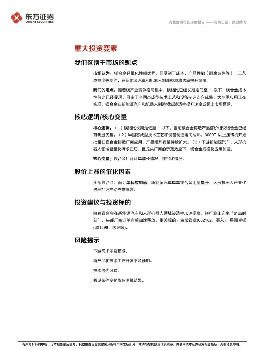 随着镁合金在新能源汽车和人形机器人领域渗透率加速提高,镁行业正迎来“奇点时刻”,头部厂商订单有望加速释放,相关标的:宝武镁业(002182,买入)、星源卓镁(301398,未评级)。