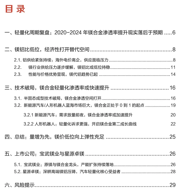 技术迭代风险。若有比镁合金性能更优、价格更低的轻量化材料产业化应用,则可能压制镁合金的市场空间和渗透率提升速度。