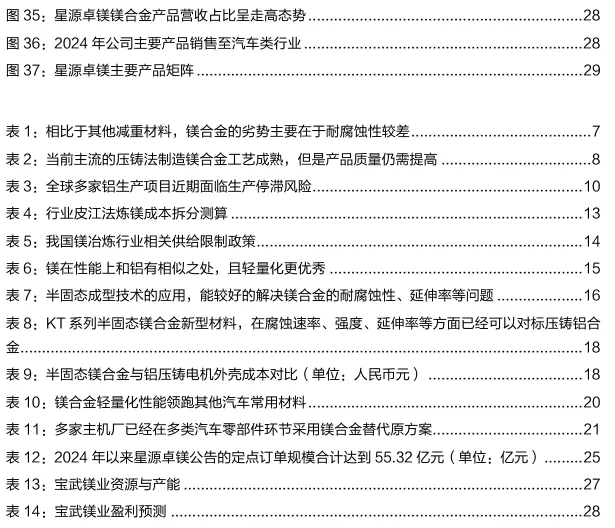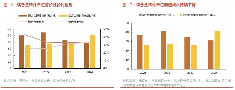 从市场表现来看,镁合金应用实际上已经具备市场化的成本竞争力。据元镁体数据,以星源卓镁为例,镁合金和铝合金铸件的单重售价差距已经明显收敛,2021-2024年上市公司镁合金铸件单重售价为101/110/86/88元/KG,同期铝合金铸件单重售价为71/75/77/103元/KG,而且由于铝价涨幅较大,镁合金铸件价格优势开始体现。而2021-2024年公司镁合金铸件单重制造成本从2021年的37元/KG降至2024年的31元/KG左右,因此从毛利率来看,到2024年,公司镁合金铸件毛利率达到34%,较铝合金铸件毛利率高出1.1pct,这意味着,随着技术迭代,公司镁合金铸件在降价的同时,毛利率仍能维持,对下游终端而言,镁合金的市场化竞争力已经开始显现。