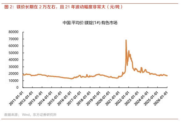原因之一是成本:镁价相较于铝没有经济性优势,且过往波动较大,且下游企业接受度不高。从2011年以来,镁价长期维持在2万元/吨左右,2021-2022年间,煤炭、硅铁等原材料价格大幅上涨,因产业政策和环保原因部分镁冶炼企业关停产能,供需关系失衡,原镁价格从低点13740元/吨 最高68470元/吨,最大涨幅接近400%,波动幅度远大于铝、钢铁等其他替代材料品种。由于长周期镁性价比不高,且波动幅度过大,是下游企业对镁合金材料接受度不高的重要原因。
