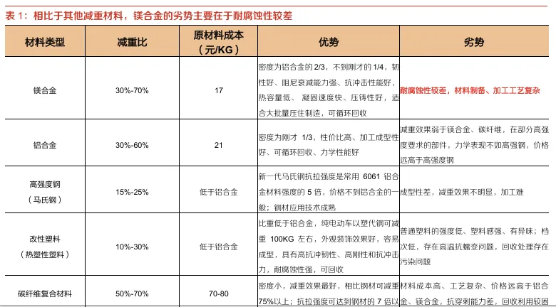 市场认为:镁合金轻量化性能优异,但受制于成本、产品性能(耐腐蚀性等)、工艺成熟度等制约,在新能源汽车和机器人制造领域渗透率提升缓慢。