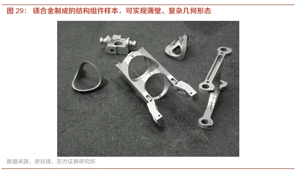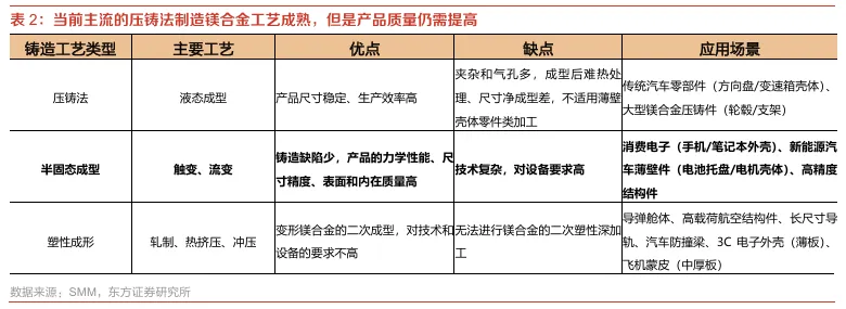 另外,工艺和设备不成熟也是此前牵制镁合金大规模应用和经济性的重要因素。据SMM,镁合金成型工艺可以分为液态、半固态、塑性类,当前镁合金成型主要采用压铸法,工艺成熟且生产率高,但缺点也较为明显:夹杂和气孔多、成型后难热处理、尺寸净成型差等等,因此目前镁合金应用领域主要是传统大型的汽车零部件(如方向盘、变速箱壳体、轮毂、支架等)。