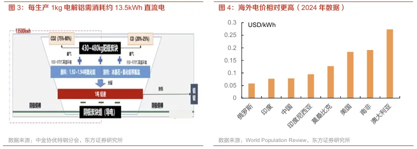 电解铝属于高能耗行业,而海外电价当前较高。现代铝工业生产中通常采用冰晶石-氧化铝融盐电解法:熔融冰晶石作为溶剂,氧化铝作为溶质,碳素体被用作阳极,铝液被用作阴极,在950℃-970℃的温度下,电解槽内的两极之间通入强大的直流电,从而进行电化学反应,实现电解过程,最终产出的电解铝经过混合、保温、铸锭等过程加工为铝锭等产品运送至下游客户。据中金协优特钢分会披露的数据,每生产1kg电解铝大约需要消耗1.92-1.94kg氧化铝、0.43-0.48kg预焙阳极(阳极碳素),以及约13.5kWh的直流电,属于高耗能行业。因此,铝项目的运营效益与电价挂钩较为显著;相对而言,海外用电成本较为高昂(印尼、美国、澳大利亚等地区的电价均显著高于中国)、部分工业基础设施不如国内完善,电解铝项目所需投资额与运营成本均较高。