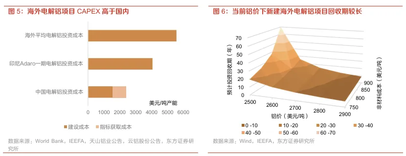 海外电解铝投资CAPEX高企,目前铝价下海外企业投资动力或不足。据World Bank与IEEFA,海外新建电解铝项目的平均吨铝CAPEX接近6000美金;较低成本项目例如印尼Adaro一期50万吨/年电解铝总投资额约为20.3亿美元,折合单吨CAPEX也超过了4000美金;相比之下,国内单吨电解铝产能投资额较低,计入购买电解铝指标所需成本后,单吨投资成本仅为约2419美元。因此,在国内电解铝产能受限的背景下,“产能出海”尚将面临较为高昂的投资成本。根据我们按照2025年10月底向前半年滚动平均铝价2604美元/吨进行的测算,当前海外电解铝项目的投资回收期大约将在13.0年-25.0年不等(随非材料成本变动);仅有当铝价到达2800-2900美元/吨一线时,项目回收期大致回落到7-11年左右,预计才会令海外铝企投资动力增强。因此电铝产能在短期内或仍显紧俏。
