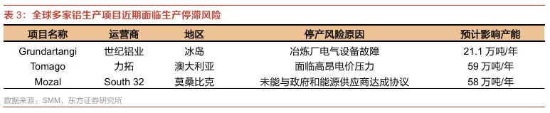 海外供应端持续扰动,亦令全球电解铝供应不确定性上升。在海外CAPEX高企、电价高位的背景下,产能运行也面临不同程度的扰动压力。例如世纪铝业位于冰岛的Grundartangi项目因冶炼厂电气设备故障面临21.1万吨/年 的影响;力拓在澳大利亚运营的Tomago项目则因区域电价显著上行而承受较大成本压力,存在59万吨/年的潜在减产风险;南-32位于莫桑比克的Mozal项目因无法与政府及能源供应商达成电力协议,或面临58万吨/年的产能受限。我们认为,这类供应扰动并非孤立事件,而是在高成本、高能耗行业格局下的常态化风险点,进一步强化了全球电解铝供给端的紧张情绪。