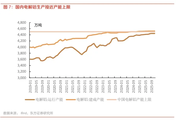 国内电铝供应受政策“红线”严控,呈现高度紧张态势。国内电解铝生产受限于电解铝产能的政策“红线”;截至2025年11月末,我国电解铝建成产能约4524.2万吨/年,运行产能约4443万吨/年,产能利用率超过98%,几乎触及4500万吨/年的天花板。我们认为,在产能总量接近政策“红线”、新增受限的背景下,供给端高度刚性,边际增量难以释放,现有产能满负荷运行已成常态。