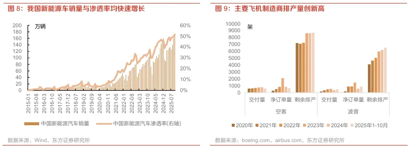 新能车与航天制造保持景气,轻量化合金材料需求延续强劲。我国新能源汽车销量和渗透率快速增长,截至2025年10月,新能源汽车销量已达到171.5万辆,同比增长约20%,渗透率达52%。航材方面,全球两大整机厂空客与波音的排产水平持续提升,积压订单创新高,反映出未来十年以上高度明确的行业需求周期。自年初截至2025年10月末,空客净订单量625架、剩余排产量达8,698架,接近十年满产水平;波音同样维持较高订单量,截至2025年10月剩余排产量达6,534架,较2020年提升近60%。在新能源汽车高速增长,以及全球航空出行需求的恢复、新一代机型的快速替换、中国自主民机推进带来增量市场的多重驱动下,铝合金作为性价比较优的轻量化材料,其在汽车一体化压铸、航空航天铝材等应用空间持续扩大,未来需求的长期增长有望得到充分保障。