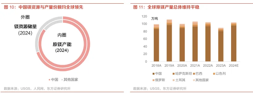 中国为世界主要镁产区,原镁产量近年大体保持稳定。镁是地壳中资源储量最为丰富的轻金属元素之一,在自然界中主要以固体矿和液体矿的形式存在,其中固体矿主要有菱镁矿、白云石等,液体矿主要有海水、天然盐湖水、地下卤水等。当前开采镁资源主要是通过白云石、菱镁矿等固体矿物。我国镁资源储量居世界首位,拥有世界镁资源储量的70%;原镁产能约1800万吨/年,占到全球比重的85.7%。产量方面,据USGS预计,2024年全球原镁产量将达约100万金属吨,其中中国产量约95万吨,份额同比提升约2pct,占据绝对领先地位。