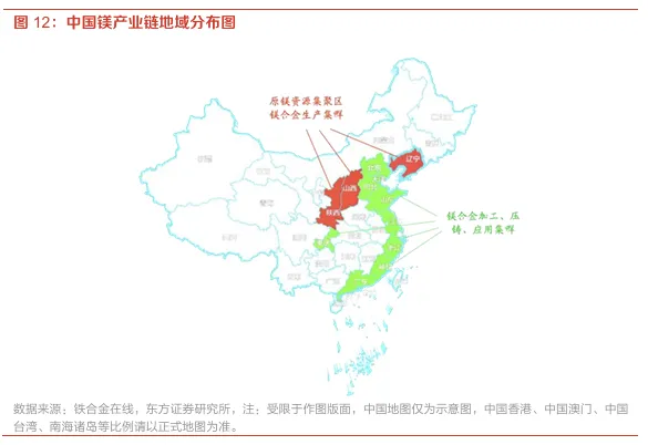 中国镁产业地域分布与资源集聚、产业集群呈现一定相关性。我国含镁白云石矿储量丰富,产地主要分布在辽宁、陕西、山西、宁夏、河南、青海、贵州等省份,其中陕西榆林地区是我国的原镁主产区,该地区原镁产量占全国产量的2/3。镁合金生产、加工方面,相关产业布局主要分布在重庆、长三角、珠三角、泛渤海等地区,与其他下游产业(如电子信息、汽车工业等)形成联动。
