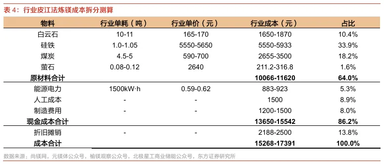 皮江法为行业炼镁主流,奠定了国内镁行业成本中枢。目前行业主流炼镁工艺主要有两种:电解法与热还原法。20世纪,电解法是主要的炼镁方法,2000年后,皮江法在中国得以广泛应用(该法镁生产量已达70 %以上),到目前为止,在我国只有青海民和镁厂等少数几家采用电解法生产。相比电解法对电力价格极为敏感、单位能耗高、固定资产投入大的特点,皮江法在白云石资源禀赋充足、煤炭与硅铁成本具优势的中国具备显著的经济性——从成本结构看,皮江法白云石、硅铁、煤三项原料合计占比约64%,其中硅铁成本贡献最高(约34%);电力成本占比仅约5%。在此结构下,据我们测算,行业现金成本整体位于1.36-1.55万元/吨区间,完全成本约1.53-1.74万元/吨。