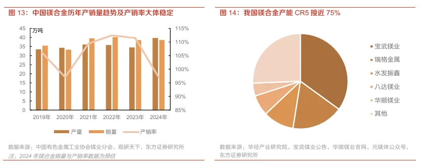 我国镁合金产销近年大体稳定,产能集中度较高。据中国有色金属工业协会镁业分会,2024年我国镁合金产量39.68万吨,同比增长约15%;近年来行业大抵保持供需平衡,产销缺口不大,产销率基本在100%上下波动。从竞争格局看,行业呈现明显的头部集中态势,CR5合计约占74%,宝武镁业、瑞格金属、水发振鑫、八达镁业及华顺镁业五家龙头形成较强的规模化与成本优势;其余企业规模分散,合计占比较低。整体来看,镁合金行业“强者恒强”趋势显著,供给端稳定性较高,或有利于维持行业价格体系的运行韧性。