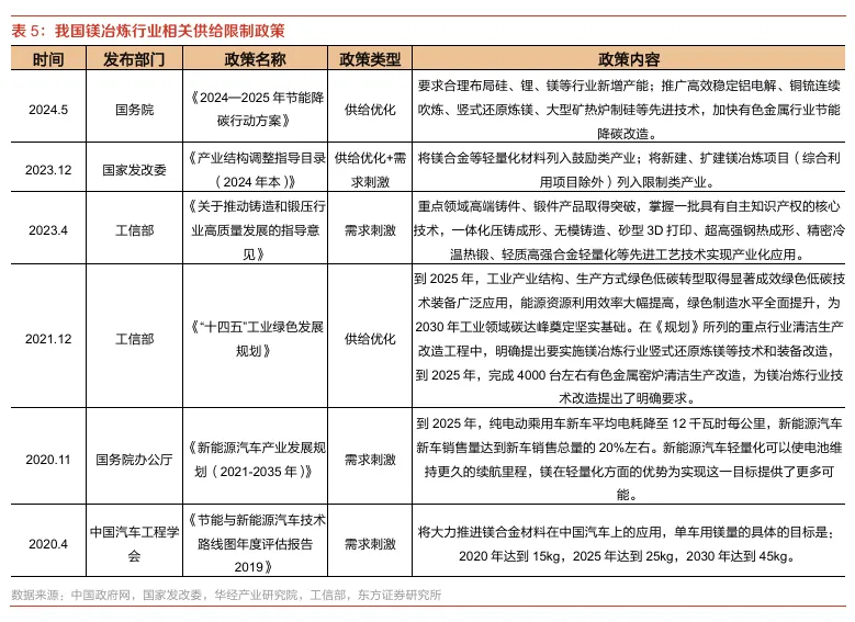 需求刺激与供给优化政策并举,利好头部镁冶炼企业进行份额集中。近年来,随着环保政策的趋严和生产技术的进步,镁合金的生产逐步向绿色和高效方向发展。一方面,镁冶炼行业能耗水平高,被国家纳入重点监管与限制;《产业结构调整指导目录(2024年本)》已将新建、扩建镁冶炼项目列入限制类产业,国务院、工信部等部门也分别提出要合理布局镁等行业新增产能、加快节能降碳改造,要求镁冶炼完成竖式还原等技术升级。另一方面,通过支持轻量化材料和新能源汽车发展刺激镁合金需求增长,例如中国汽车工程学会在《节能与新能源汽车技术路线图年度评估报告》中提出:计划2025年单车用镁量达到25kg,2030年达到45kg;工信部也提出了轻质高强合金轻量化等技术实现产业化应用的指导意见。我们认为,供给端的优化政策有望充分压制行业低端产能进入,叠加需求端扩容的大方向,或将在较大程度上利好头部企业凭借技术与资金优势提升市场集中度,稳固行业地位。