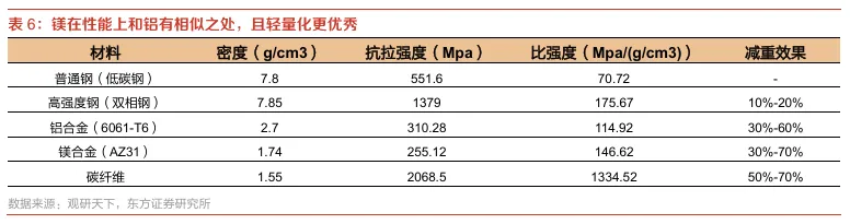 镁合金减重效果优势显著,“镁代铝”符合轻量化趋势。镁合金在密度、抗拉强度及比强度上表现出优异的性价比,减重效果可达30%-70%,明显优于普通钢和高强度钢,与铝合金基本持平;同时密度低,且在成本方面优于碳纤维材料。根据2020年发布的汽车轻量化技术发展路线图2.0,要求到2025年整车质量相较彼时减重10%-15%,到2035年整车质量减重25%-35%;2025年单车镁合金用量目标为25kg,至2030年单车用镁量提升至45kg。在轻量化趋势和新能源汽车高速增长的双重驱动下,镁合金作为性价比较优的轻量化材料,其在一体化压铸、车身结构件等关键部位的应用空间持续扩大,未来市场潜力巨大。