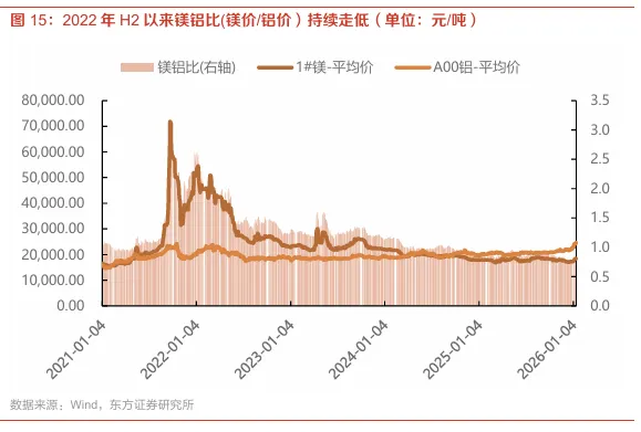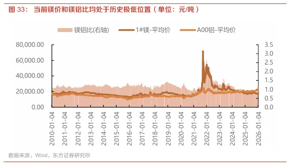 镁价和镁铝比均处于历史极低位置,未来镁价可预期的向上空间充足。截至2026年1月14日,国内原镁现货价1.85万元/吨,处于2010年以来的9.7%分位,镁铝比为0.75,处于2010年以来的0.4%分位,均处于历史极低位置。考虑近期铝价继续创高,镁合金性价比愈发显现,镁合金渗透率或加速提升,低镁铝比情况下,未来镁价可预期的向上空间充足,若按照镁铝比回到1.0计算,镁价向上空间34%左右。