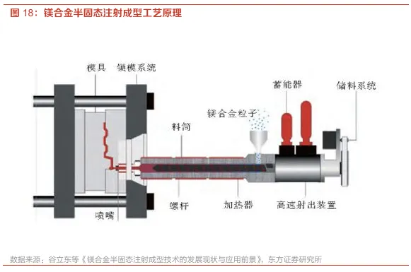 镁合金半固态成型技术逐步走向成熟,将解决传统镁合金的技术痛点。注射成型是半固态触变成型技术的一种,其与压铸的主要区别在于原料的状态。半固态注射成型技术的原理为镁粒子在重力或负压作用下进入料筒,经加热器作用,镁粒子在前进的过程中既被加热又被剪切,并受螺杆的作用被挤压产生变形,使得其被转变为半固态浆料,并通过喷嘴高速注入模具中,在高速高压下快速冷却凝固,从而形成零件。半固态成型技术的核心优势在于,它巧妙地利用了镁合金在固液两相共存区时,在剪切力作用下表现出的显著“剪切变稀”特性,突破了传统液态铸造易产生气孔、缩松、氧化夹杂等局限,可实现高质量、高效率、低成本的复杂零件制造。