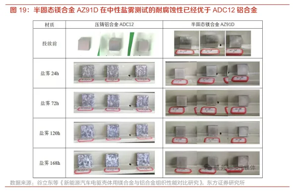 半固态成型镁合金产品可达到压铸铝压铸铝合金力学和腐蚀性能。相较于铝合金产品,镁的耐腐蚀性不良,这使得部分应用于水溶液或者腐蚀性液体的零部件无法以镁合金为原材料,这也是制约镁合金渗透率提升的重要原因之一。半固态技术能够通过减低镁合金内部的孔隙率、提高成型件的致密度来改善镁合金产品的耐腐蚀性。据上海交通大学相关团队研究,中性盐雾测试显示,新型半固态镁合金素材耐蚀性优于压铸 ADC12 铝合金,为高要求场景应用提供保障。