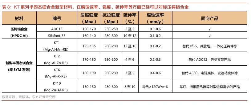采用半固态成型工艺,镁合金铸造成本端也将逐步具备优势。以电机外壳为例,与铝压铸相比,其模具摊销成本仅为铝合金的一半(镁合金模具寿命16万模,铝合金模具寿命8万模);材料成本方面,由于镁合金密度较小,在满足同等性能要求下,镁合金重量更轻,材料成本相对较低;在设备折旧、电耗、厂房等方面,半固态镁合金也均优于铝压铸,综合计算下来,半固态镁合金电机外壳总成本比铝压铸降低了17%左右。