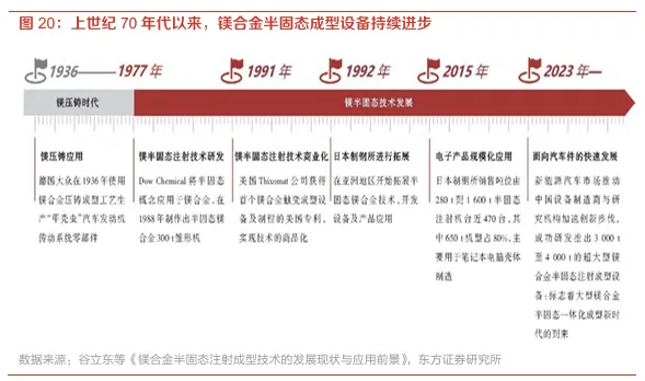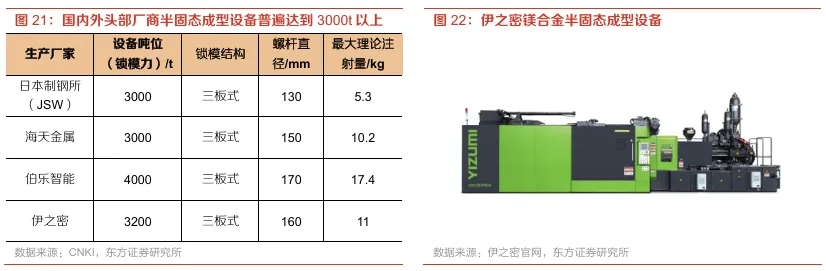 半固态成型设备进步明显,镁合金应用产品矩阵有望扩大。镁合金材料应用的发展离不开成型设备的持续进步,2016年全球范围内安装使用的半固态镁合金设备吨位范围主要是280-1300t(大约450台),主要用于笔记本电池壳体制造。到2020年,新能源汽车产业的崛起再起推动镁合金半固态装备的升级,产业链开始寻求制造更大的镁合金一体化汽车结构件,近年来,国内设备制造商伊之密等着手研发大型装备,陆续推出了3000-4000吨的超大型镁合金半固态装备,为大尺寸镁合金压铸件提供解决方案(如多联屏背板、车内门板、仪表板骨架、三电结构件等),而设备的进步,有望进一步扩大镁合金产品的应用矩阵。