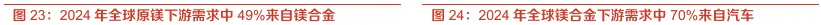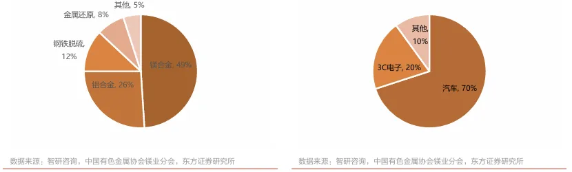 当前镁合金下游最大终端是汽车领域。从2024年全球原镁消费结构来看,镁合金为其主要下游应用领域,需求占比达49%。其次为铝合金(占比26%)、钢铁脱硫(占比12%)、金属还原(占比8%)。而在镁合金应用市场中,汽车行业为镁合金下游应用最广的领域,2024年占镁合金消费需求比例达到70%;其次为3C电子产品(占比20%)和其他需求(占比10%)。因此未来镁合金渗透率提升的重点即在于汽车尤其是新能源汽车领域,以及可能爆发的人形机器人需求领域。