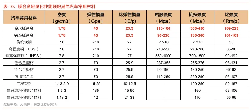 镁合金是可用在汽车上最轻的金属材料,减重潜力大。根据北京科技大学金属轻量化成形制造北京市重点实验室测试数据,镁合金(变形/铸造)的密度仅为1.78g/cm³,远低于传统软钢(7.8g/cm³)和铝合金(2.7g/cm³),是目前汽车金属材料中减重潜力最大的品类。从关键性能指标看(如下表),镁合金的比强度(抗拉强度/密度)可达169-225MPa/(g/cm³),与铝合金相当;比弹性模量(弹性模量/密度)约25.3GPa/(g/cm³),虽略低于钢和铝合金,但已能满足车身非承载结构的刚度需求。此外,镁合金还具备优异的导热性(导热系数150-170W/(m・K),优于钢和部分铝合金)与减震性(阻尼系数是铝合金的2倍),特别适合电机壳体、仪表盘等需要散热或降噪的部件。