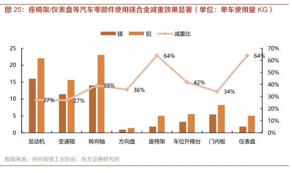 座椅架/仪表盘等汽车零部件使用镁合金减重效果显著,最高减重效果可达64%。据德国能源与环保研究所数据,汽车燃料使用的60%都消耗在汽车自重上,小型轿车每减重10%,燃油可节省约6%,传统汽车发动机部分占整车重量的12%左右,而新能源汽车的电池组占整车比重可达20%以上,因此新能源汽车产业的迅速发展对汽车轻量化提出更为迫切的需求。据府谷镁数据,相较于铝合金原料,汽车发动机/变速箱使用镁合金可减重27%左右,而在方向盘、仪表盘、座椅架等部件使用铝合金最高减重比例可达64%,减重效果显著。