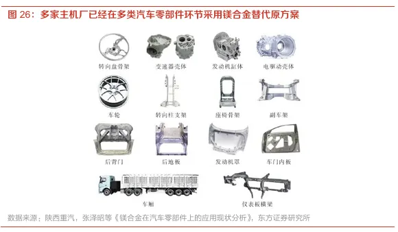 镁合金零部件在汽车领域的应用范围不断扩大。由于其优异的铸造流动性,镁合金材料非常适合用于薄壁结构件和大型内部结构件,近年来在汽车的车身系统(前端框架和前上部部件)、底盘系统(驾驶盘、副车架)等领域应用逐渐加速,目前奔驰、福特、上汽、一汽等多家主流主机厂均加速镁合金的批量应用,具体零部件包括仪表盘衡量、转向盘骨架、发动机阀盖等等。
