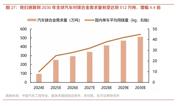 奇点已至,镁合金在新能源汽车和人形机器人领域或迎来渗透率加速提升。解决了价格、技术工艺痛点后,镁合金应用空间有望打开。新能源汽车领域,目前奔驰、福特、上汽、一汽等多家主流主机厂在汽车的车身系统(前端框架和前上部部件)、底盘系统(驾驶盘、副车架)等环节均加速镁合金的批量应用。我们测算,全球汽车领域对镁合金的需求量有望从2024年的95万吨增长到2030年的512万吨,6年间增幅达到4.4倍,CAGR为32%;人形机器人领域,作为人形机器人理想的轻量化材料,镁合金有望跟随人形机器人产业爆发开启第二成长曲线。随着多家厂商2026年开启商用机器人量产,对镁合金需求有望迎来从0到1的爆发式增长。