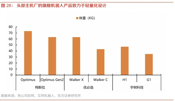 人形机器人减重诉求强。轻量化是人形机器人实现长久续航、灵活运动、低成本落地的必然路径:(1)提升续航:重量降低,意味着运动耗能减少,同等电池容量下工作时间大幅延长;(2)增强灵活性:更轻的本体惯性更小,动作更敏捷,交互更稳定;(3)降低硬件压力:对电机、减速器等核心部件的性能要求降低,有助于降低成本与供应链风险。据元镁体数据,人形机器人重量每降低10%,能耗可减少5.5%,续航也将同步提升5.5%,轻量化成为提升产品力的关键路径。近年头部主机厂发布的旗舰产品均致力于轻量化设计,全身质量均有下降。
