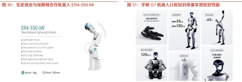 (3)埃斯顿:宝武镁业与埃斯顿联合推出的 “ER4-550-MI" 工业机器人,通过镁合金替代铝合金部件,整机重量减轻 11%,节拍速度提高了 5%;