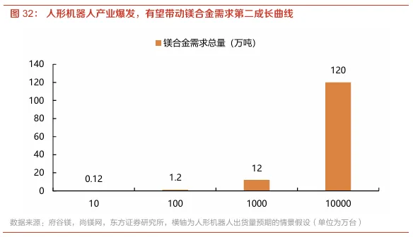 作为人形机器人理想的轻量化材料,镁合金有望跟随人形机器人产业爆发开启第二成长曲线。随着多家厂商2026年开启商用机器人量产,对镁合金需求有望迎来爆发式增长,按照单台人形机器人镁合金用量12KG计算,若假设未来人形机器人出货量达到100/1000万台,则对镁合金需求量达到1.2/12万吨,远期若出货1亿台,对镁合金需求量有望达到120万吨体量。考虑国内人形机器人主机厂合作的镁合金厂商主要集中在宝武镁业、星源卓镁等企业,头部镁合金企业有望显著受益于订单放量。
