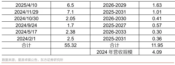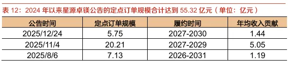 需求为锚,量增为先。我们认为随着半固态成型技术进步,当前镁合金正迎来渗透率提升的“奇点时刻”,新能源汽车和人形机器人将拉动镁合金需求快速爆发。以星源卓镁为例,我们统计了2024年以来公司公告的客户定点公告, 2024年全年公司的营收规模仅4.09亿元,但是2024年以来公司接到的定点订单规模合计已达到55.32亿元,而且公司公告的定点订单多数从2026年H2后开始集中释放,我们按照年均收入贡献计算,从2026年下半年开始公司年均集中释放的收入平均为11.95亿元,较公司2024年营收有较大规模增长。