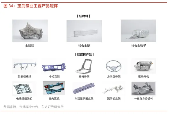 宝武镁业主要产品覆盖汽车轻量化压铸件、结构件及中大件一体化镁铸件。截至2024年末,公司镁制品事业部目前配备153条自动化生产线,设备吨位覆盖250T-7000T,具备强大的多尺寸铸件业务承接能力,能够满足不同客户的多样化需求。在公司镁制品业务发展初期,产品主要聚焦于汽车小件,例如方向盘、转向件等。近年公司集中优势资源,在积极拓展仪表盘支架、车载显示屏支架、座椅骨架、中控支架等中大型镁铸件业务领域的同时,不断推进一体化车身镁铸件业务。目前,公司已与采埃孚、吉利星驱、极氪威睿、汇川动力等重要客户紧密合作,未来将共同开展镁合金压铸中大件的开发工作。